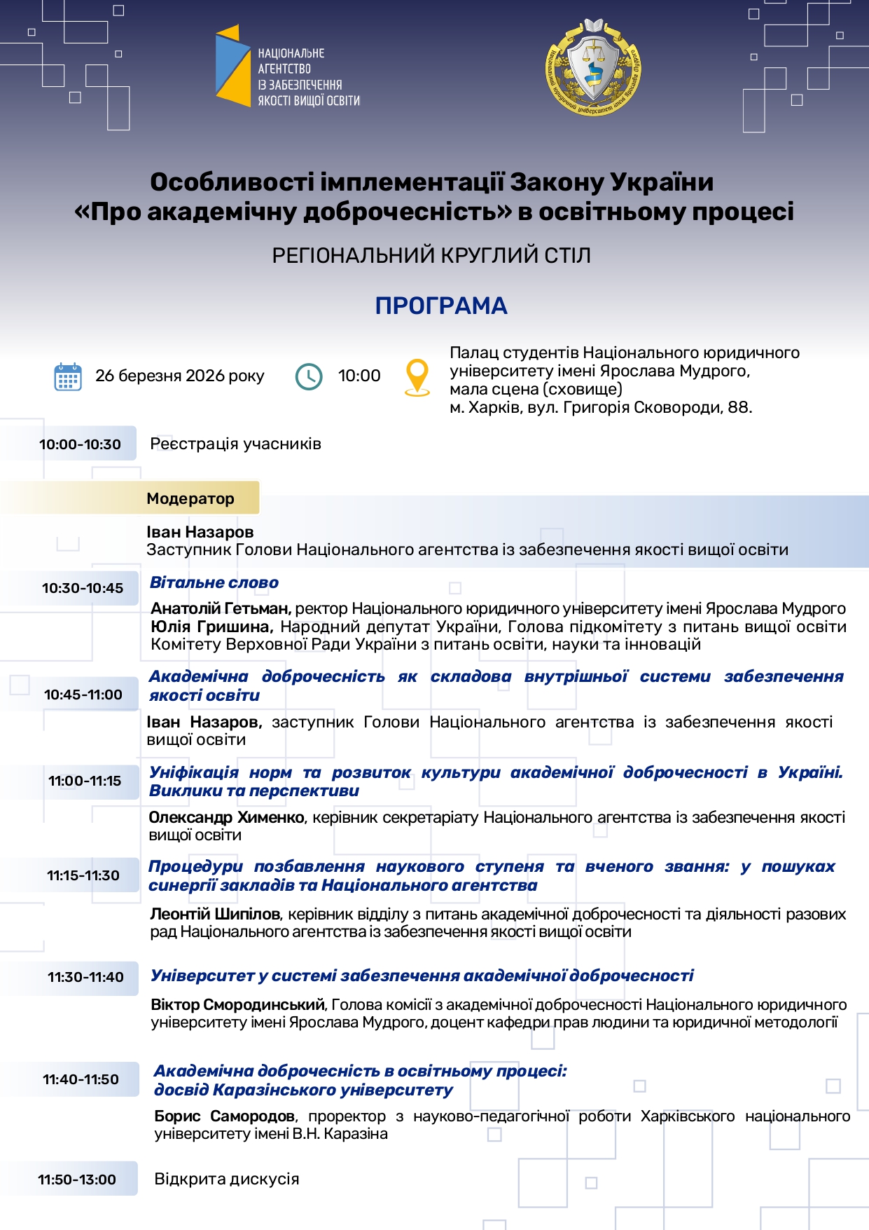 Директорка НБ ДБТУ Ніколаєнко Н.М., канд.наук із соц.комунікацій долучилася до засідання регіонального круглого столу «Особливості імплементації Закону України «Про академічну доброчесність» в освітньому процесі», що організувало Національне агентство із забезпечення якості вищої освіти на базі Національного юридичного університету імені Ярослава Мудрого 26.03.2026 р.